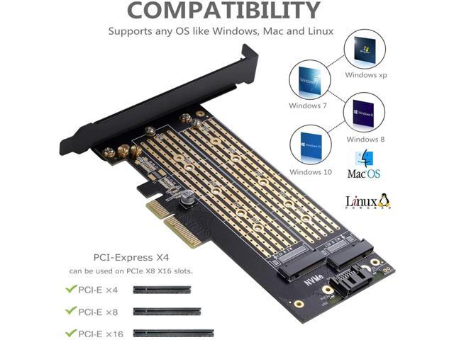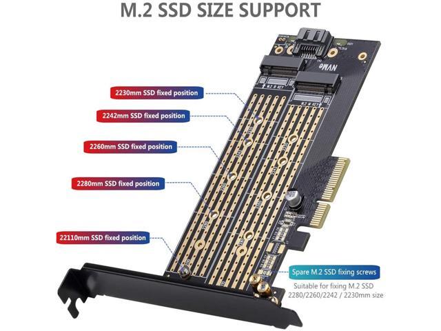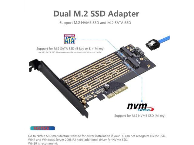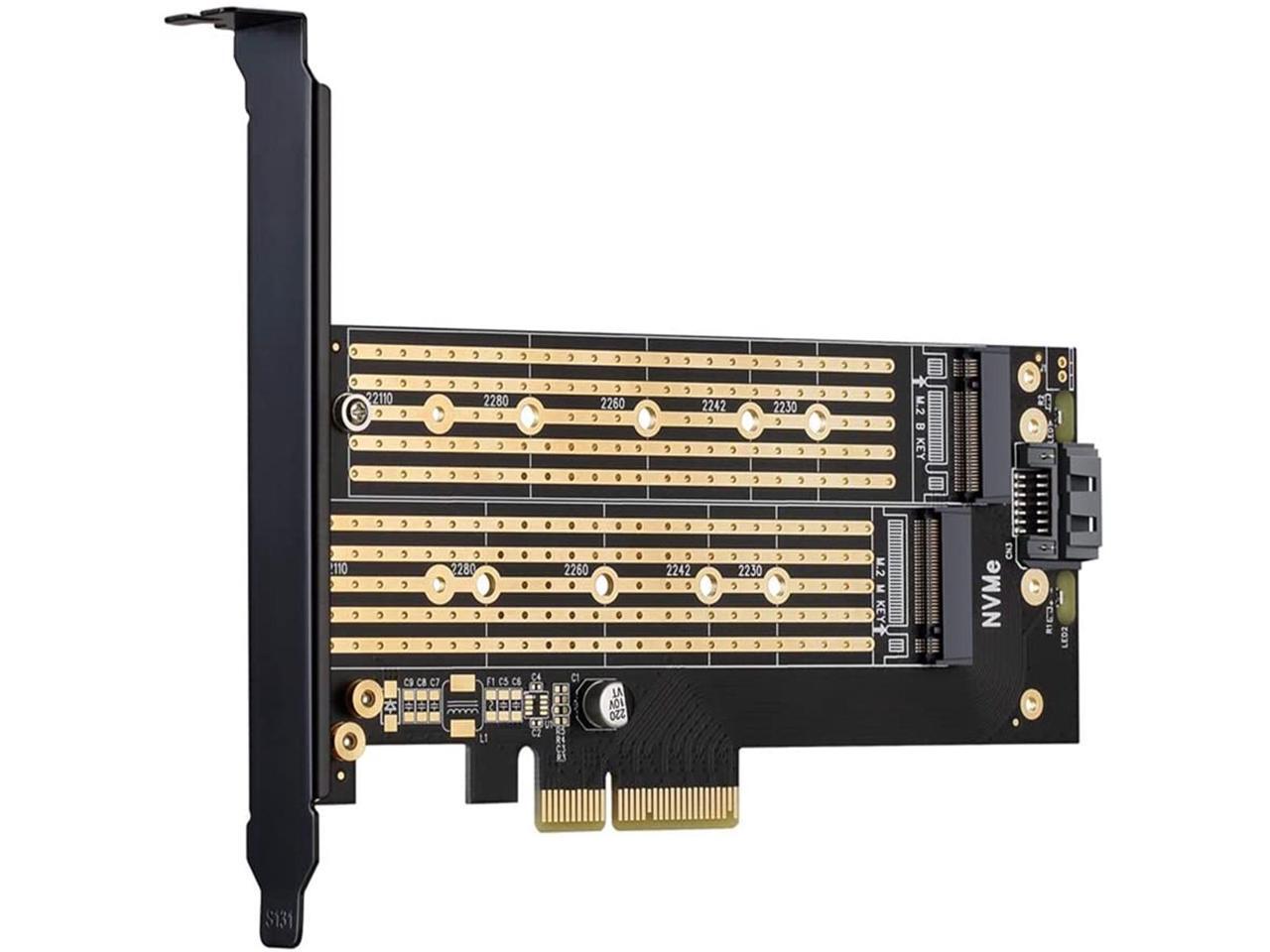 - Converts one M.2 NVMe SSD (M Key) interface to PCIe 3.0 x4 interface (PCIe 2.0 Compatible), Converts one M.2 SATA SSD (B Key or B+M Key) interface to SATA 6Gbps interface (SATA cable connection required).