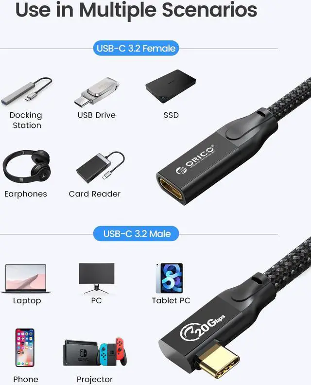 Usage 4: For SSD HDD docking station --------- Note --------- Why Choose ORICO Type C Extension Cable? Faster Transfer Speed, USB 3.2 Gen2*2 (20Ggbs) Fast Charging PD100W for laptop, phone, and other device. Support up to FullHD 4K Video Ouput at maximum 3840x2160 60Hz. enjoy crystal-clear HD video experience. Durable and Flexible braided, aluminum alloy plug and copper core to provide a better experience. ------ Product Features ------ - 20Gbps Transfer Speed USB 3.2 Gen 2*2 Gbps Transfer Speed, handle large files easily. Theoretical Speed up to 2500MB/s, Practical Speed up tp 2000+MB/s. (The original cable and the extension cable should all support 20Gbps transfer speed. ) - Up to 100 W Power Delivery which is very suitable for usb-c devices and can provide power transmission for laptops or mobile phones.