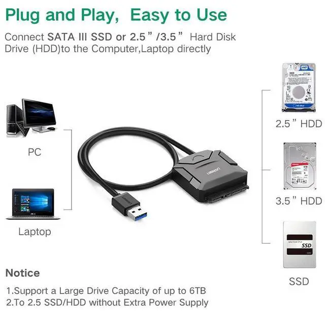 2. USB 3.0 to SATA converter allows you to connect any standard 2.5 inch or 3.5 inch SATA HDD mobile enclosure to your computer / laptop via USB 3.0 Port at speed up to 5Gbps. It is ideal for you to backup files or upgrade your notebook / PC hard drive.