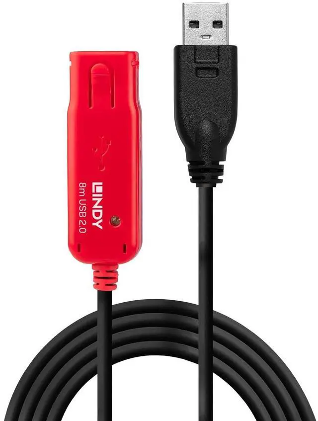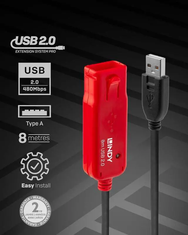 USB 2.0 High Speed (480Mbps), backwards compatible with USB 1.1 Full Speed (12Mbps) and USB 1.0 Low Speed (1.5Mbps),Can be used as an active 8m extension cable or as part of our USB Active Extension System for even longer lengths,Connectors: USB A Male to USB A Female ,Locking connector feature (when used with compatible cables from the LINDY Extension Cable Pro range only),Plug and Play â no additional drivers required ,USB bus powered,Supports Windows ME, 2000, XP, Vista, 7, Mac OS, Linux,2 year warranty,