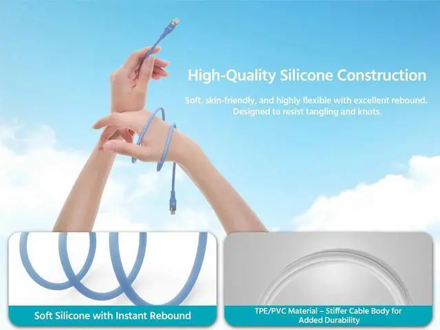 Charge with confidence using the Monoprice USBC to USBC Silicone Charging Cable, designed for highperformance power delivery and exceptional durability. Built to support USB Power Delivery (PD) up to 240W, this cable delivers ultrafast charging for laptops, tablets, smartphones, and other USBC devices. The USB 2.0 data transfer rate of 480Mbps enables essential syncing and connectivity for everyday devices, while the premium silicone jacket offers unmatched flexibility and a softtouch feel that resists tangling, even in tight setups. With a rugged build rated for 25, 000 bends, this cable is made to withstand daily use at home, the office, or on the go.