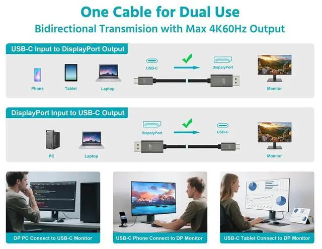 Enjoy versatile, highperformance video connectivity with this bidirectional USBC to DisplayPort cable. Connect USBC laptops, tablets, and phones to DisplayPort monitors, or link DisplayPortenabled PCs to USBC monitorsall with a single, twoway solution. Supporting resolutions up to 4K at 60Hz, it delivers sharp visuals, smooth motion, and vibrant color for work, streaming, and gaming.