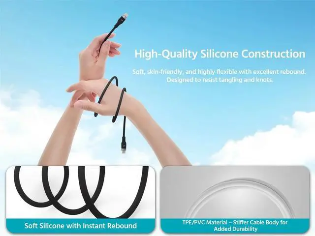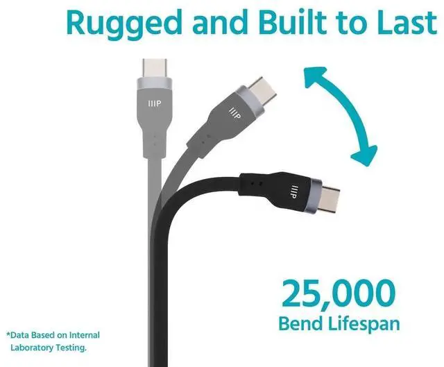 Charge with confidence using the Monoprice USBC to USBC Silicone Charging Cable, designed for highperformance power delivery and exceptional durability. Built to support USB Power Delivery (PD) up to 240W, this cable delivers ultrafast charging for laptops, tablets, smartphones, and other USBC devices. The USB 2.0 data transfer rate of 480Mbps enables essential syncing and connectivity for everyday devices, while the premium silicone jacket offers unmatched flexibility and a softtouch feel that resists tangling, even in tight setups. With a rugged build rated for 25, 000 bends, this cable is made to withstand daily use at home, the office, or on the go.