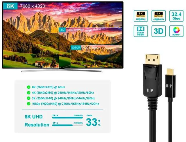 USBC to DisplayPort 1.4 Cable 8K60, 4K120, 32.4G bps HBR3, HDR, Black