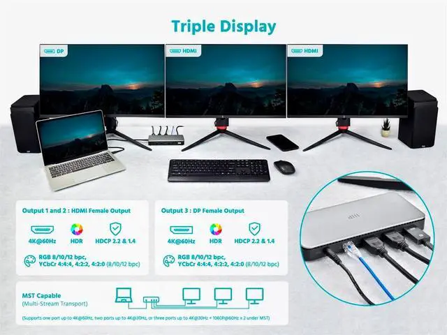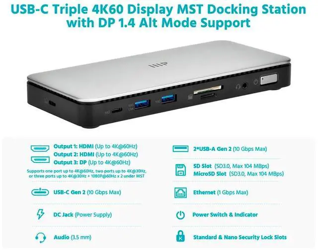 Supports triple video output (two HDMI ports and one DisplayPort) with DisplayPort 1.4 Alt Mode and MST for simultaneous multidisplay extension