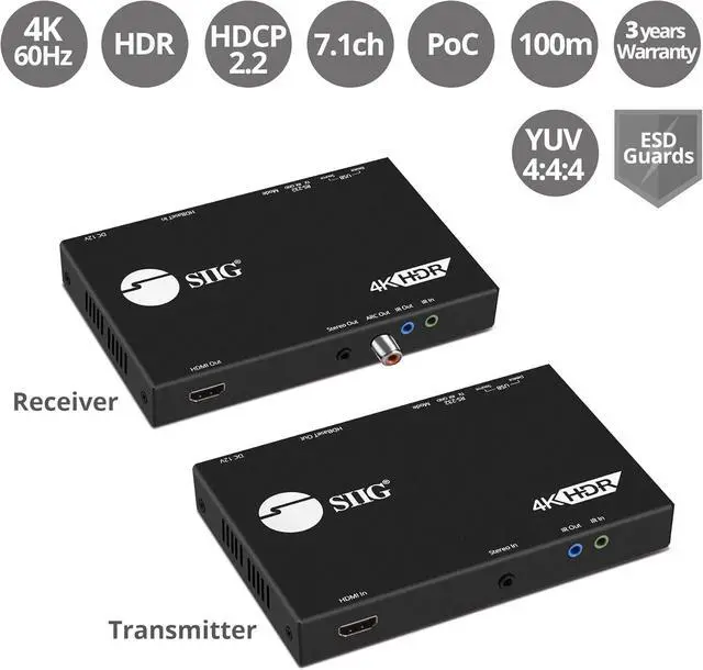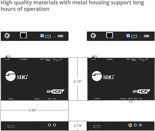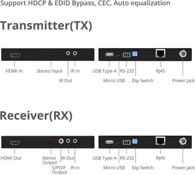Video Latency:< 20usAudioSurround sound (up to 7.1ch), stereo digital, DTS-HD Master Audio and Dolby TrueHD high bit rateSupportsFull frequency IR signal from 20KHz to 60KHzSupportsFull Duplex RS-232 control up to 115,200bps through connectorResolution480p / 720p / 1080i / 1080p / 4K 60Hz YUV444 8bit / HDR 4K 60Hz YUV420 10bit ESD protection±15kV Air / ±8kV ContactVideo bandwidthUp to 18Gbps (600MHz per channel) Transmission ProtocolHDBaseT technology (Note: Does not support connecting to Router or Switch) Trasmmission Distance StandardSpecifications (CE-H23411-S1)