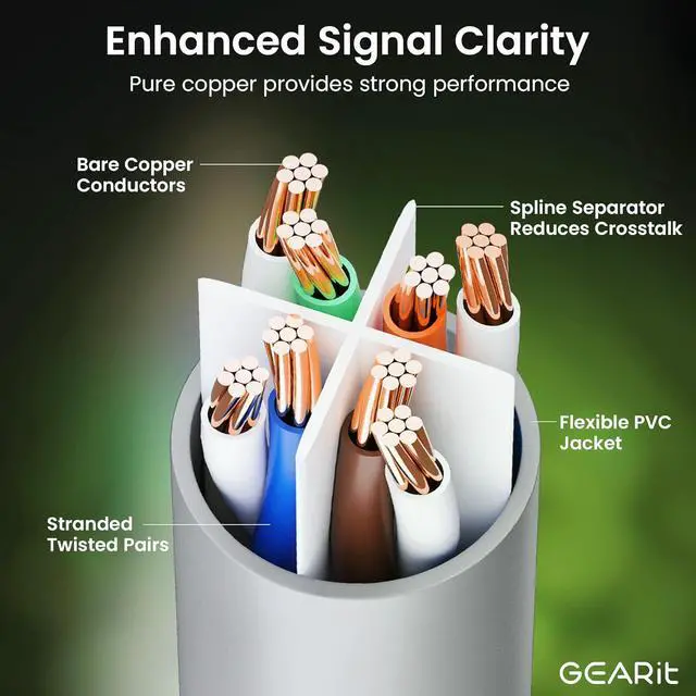 UTP 24AWG stranded conductors for flexibility, twisted in pairs and nested in a spline to minimize crosstalk, 50 micron gold-plated contacts for high-speed data transfer and corrosion resistance