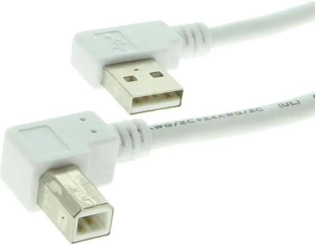3ft USB 2.0 low profile right angle type-A male to right angle type-B male white device cable. Certified USB 2.0 High-Speed Device cable that works with all USB 1.0 and USB 2.0 enable devices. Flexible and easy to work with cable constructed with 28AWG/2C+24AWG/2C wiring, UL and RoHS certified with 150 volt, 75c working capacity.