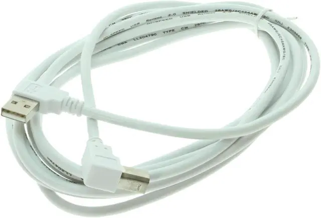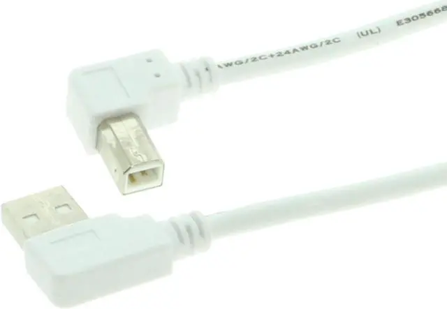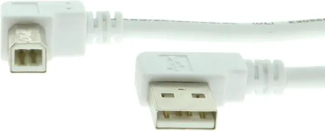 10ft USB 2.0 low profile right angle type-A male to right angle type-B male white device cable. Certified USB 2.0 High-Speed Device cable that works with all USB 1.0 and USB 2.0 enable devices. Flexible and easy to work with cable constructed with 28AWG/2C+24AWG/2C wiring, UL and RoHS certified with 150 volt, 80C working capacity.