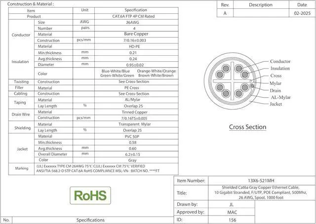 ProductCat6a Ethernet Cable, SFTP, 500 MHz, 26 AWG, SFTP(Shielded Twisted Pair) Stranded Copper, Internet CableEnd 1 & End 2Bare EndsWire Gauge26 AWG (American Wire Gauge)Conductor4 Pair, Stranded Pure CopperShield TypeAl/Mylar, Shielded Foil Twisted Pair (SFTP)JacketPVC (Poly Vinyl Chloride)MarkingTYPE CM 75°C (UL)E467139 LAN CABLE CAT6A SFTP STRANDED 26AWG 4PAIRS ANSI/TIA-568-C.2 0002FT Why Shielded Cat6a Ethernet Cable? SHIELDED CAT6a CABLE BY CABLEWHOLESALE IS A PERFECT COMBINATION OF QUALITY, COMPLIANCE AND CONFIDENCE PREMIUM COMPONENTS TECHNICAL DETAILS