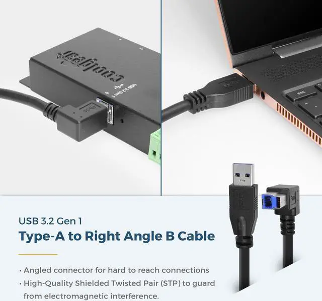 Plug and Play, perfect for USB Hubs, Printers, Adapters, and other USB Peripherals. This cable has a Left Angle B Orientation, perfect for those hard to reach locations. Our High-quality USB 3.0 cable provides a transfer rate of up to 5Gbps.