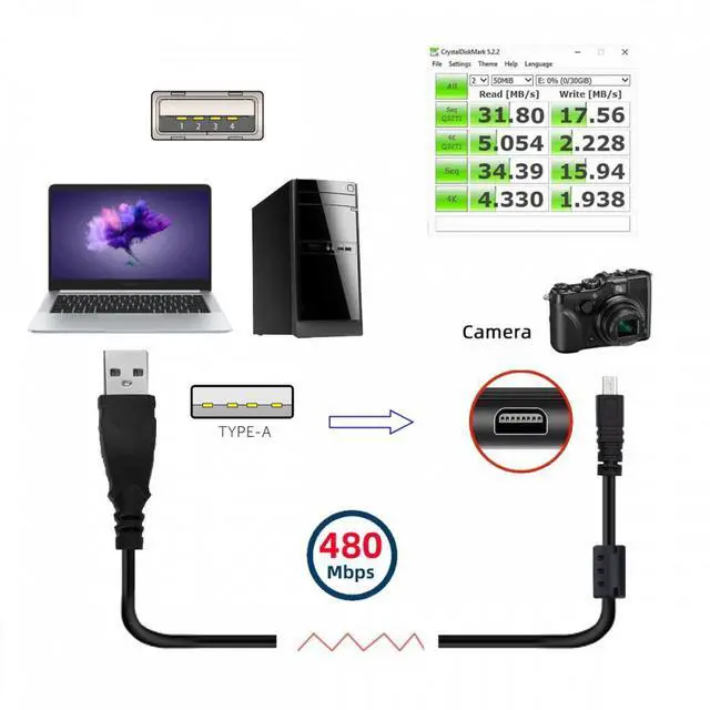 Offers a throughput of up to 480Mbps when used with USB2.0 host and device; standard 2.0 to 8P camera connector provides excellent electrical conductivity, and high-speed transmission data is fast and accurate.