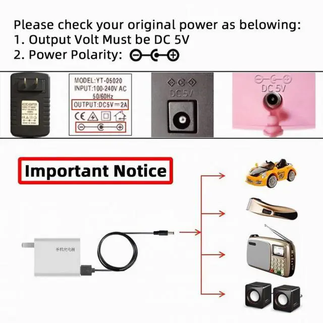 • Please make sure that the 5V input voltage of power supply is consistent with the voltage required by your equipment,and the inconsistency may cause the equipment to burn down. The wire cannot change the voltage.