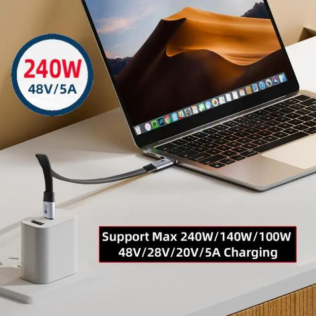This USB5.0 Cable can support Max 240W/140W/100W 28V/20V/5A Charging, It will supply power when your USB-C device is in use. Reversible Design for Type-C connector,Reversible plug orientation Cable direction.