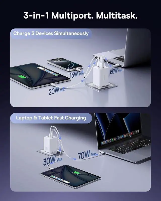 3-in-1 Multi-Port Fast Charger: Equipped with 2× USB-C & 1× USB-A ports, this 100W USB-C charger block supports simultaneous charging for three devices. And Baseus exclusive BPS 3.0 smart power allocation tech dynamically delivers optimal power to each connected device, ensures stable and efficient multi-device charging.