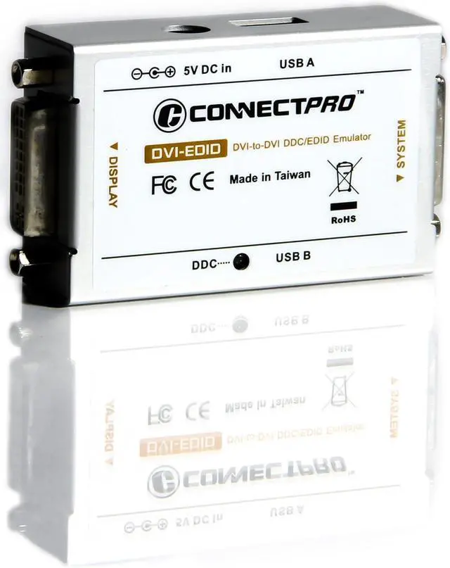 The DVI DDC / EDID Ghost Emulator Eco-Kit includes everything needed and more, for cloning and emulating a display. Package includes DVI-EDID emulator, 1 ft. M/M DVI cable, and 4 ft. USB A/B cable for power.