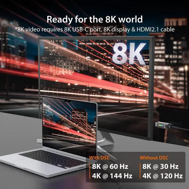 Our USB-C to HDMI 2.1 8K Cable allows you to conveniently connect your gaming laptop, MacBook, Chromebook, or tablet to an 8K UHD / 4K 144Hz external monitor, 8K UHDTV, projector and other display device using an HDMI input.