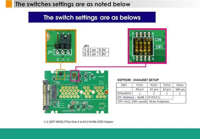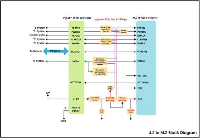 Upgrade your storage capabilities with the PCIe Gen4 U.2 (SFF-8639) to M.2 NVMe Adapter, designed to seamlessly convert M.2 NVMe SSDs to U.2 (SFF-8639) interfaces. This versatile adapter is equipped with a built-in SFF-8639 connector, adhering to the pin-out specifications defined by SFF-9402 Rev1.1, ensuring reliable connectivity.
