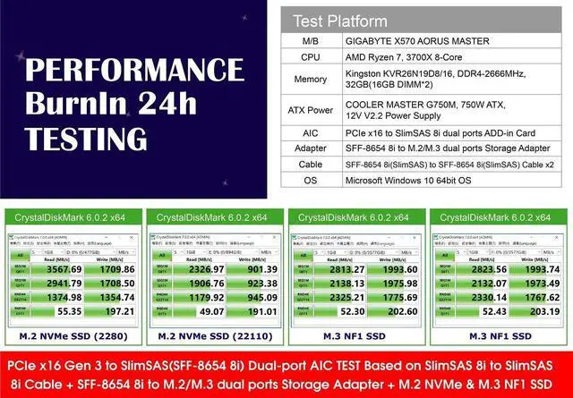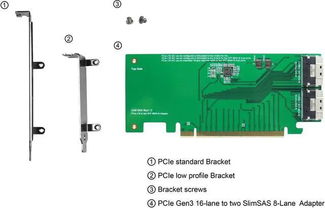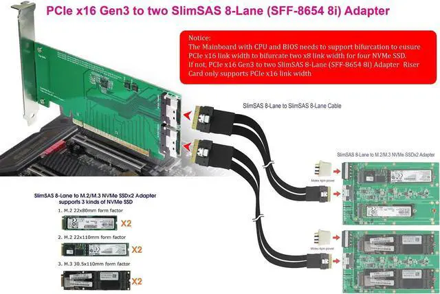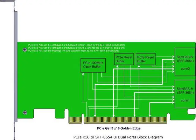 Introducing the PCIe Gen3 16-Lane to SlimLine SAS (SFF-8654) 8i Adapter, the ultimate solution for high-performance storage connectivity. This adapter allows you to bifurcate your PCIe x16 link width into two x8 link widths for four NVMe SSDs, ensuring maximum performance and data transfer speeds. With the ability to bifurcate your link width, this adapter can be used in quad x4 data link width configurations, as well as two x8 data link width configurations, making it the perfect solution for any system. The adapter can also be used over a cable to extend your x16 data link width, making it ideal for those who need to extend their data transfer capabilities. This adapter features four internal NVMe (SFF-8654 8i x2) for high-performance storage connectivity. The build-in SlimSAS (SFF-8654) 8i connector 2 sets, pin-out defined by SFF-9402, and eight internal lanes per SlimSAS 8i port, 6.4Gb/s per port, allows you to connect up to four physical NVMe devices. The adapter also supports SFF-9402 clock pin out, Intel define Mini SAS HD (SFF-8643) clock pin out, SFF-9402 perst# pin out, and Intel Define Mini SAS HD (SFF-8643) perst# pin out, enabling the system clock & perst# signal to be used over longer trace lengths and over a cable. The adapter is compliant with NVM Express 1.2a, PCI Express Base Specification Rev 3.1, SSD_Form_Factor_Version1_a, and SFF-8654 Specification Version 1.2. It also supports a wide range of operating systems, including VMware, Linux, Windows 8 &8.1, Windows 10, and UEFI 2.3.1 or later. Micro SATA Cables PN #SAS-1675-8I