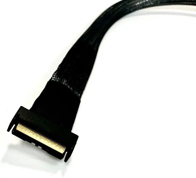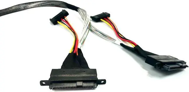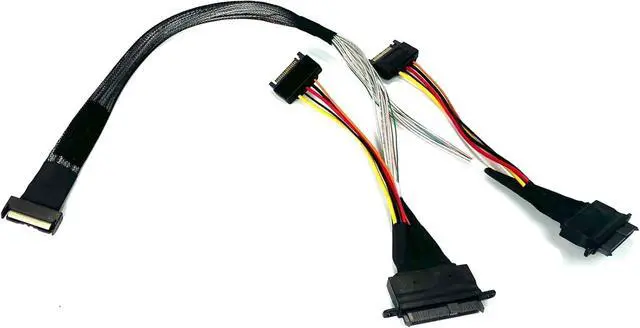 The MCIO 74 P to 2 X SFF-8639 U.2 Cable - 50CM is a cable designed to connect devices that use the U.2 interface to a motherboard or host controller. The cable has a length of 50 centimeters, making it suitable for connecting devices within a reasonable distance. The cable features a MCIO 74 P connector on one end and two SFF-8639 U.2 connectors on the other end. The MCIO 74 P connector is typically used to connect to the motherboard or host controller, while the SFF-8639 U.2 connectors are used to connect to U.2 compatible devices such as solid-state drives (SSDs). The MCIO 74 P connector is a multi-lane connector that allows for high-speed data transfer between the motherboard or host controller and the connected devices. It provides a reliable and secure connection, ensuring efficient communication between the devices. The SFF-8639 U.2 connectors are commonly used in enterprise-grade storage systems and high-performance computing environments. They support the U.2 interface, which is a small form factor connector designed specifically for high-speed data transfer in storage devices. U.2 connectors provide fast data rates, low latency, and high reliability. The 50-centimeter length of the cable allows for flexibility in positioning the connected devices within a system. It provides sufficient reach to connect U.2 devices placed reasonably close to the motherboard or host controller. Micro SATA Cables Part#MCIO-2048-2XU2