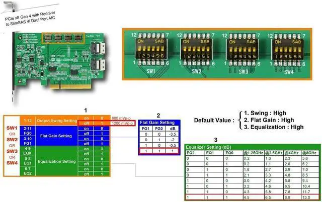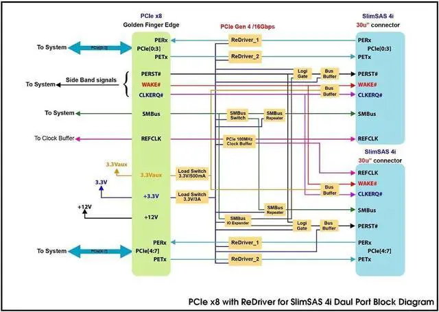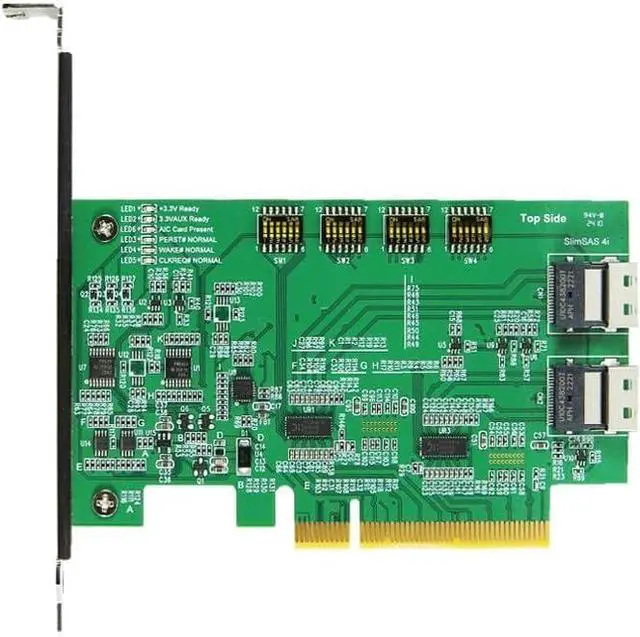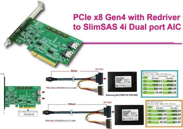 PCIe Gen4 offers a data transfer rate of up to 16 GT/s per lane, resulting in a total bandwidth of up to 128 GB/s for an x8 configuration. It utilizes the SlimSAS 4i SFF-8654 connector for high-speed data transfer, where 4i signifies support for four lanes of SAS. The SFF-8654 connector is defined for high-density, high-speed applications, commonly used for internal cabling in servers and storage systems. The AIC (Add-In Card) features Dual Port, providing two independent ports for connectivity, enhancing reliability and performance in enterprise environments through redundant or multi-path connections. It includes a ReDriver, a signal conditioning device that extends the reach and improves the integrity of high-speed signals by amplifying and equalizing them to compensate for losses over long traces or cables, ensuring reliable data transfer over extended distances. This AIC can be inserted into a PCIe slot on the motherboard to add functionality, specifically providing connectivity between PCIe x8 Gen4 lanes and SlimSAS 4i interfaces. Key Features and Benefits: High Throughput: PCIe Gen4 x8 supports high data rates suitable for demanding applications like data centers, AI, and high-performance computing. Signal Integrity: The ReDriver ensures high-speed signals maintain their integrity over long distances, crucial for performance and reliability. Versatile Connectivity: The dual-port SlimSAS 4i interface offers flexible, high-density connections, ideal for modern storage solutions and high-performance networking. Enterprise-Grade: Designed for enterprise environments where performance, reliability, and flexibility are critical. Use Cases: Data Centers: Connecting high-speed storage devices and servers to maximize data throughput. High-Performance Computing (HPC): Facilitating fast data transfer between compute nodes and storage systems. Networking: Enhancing network performance with high-speed data paths.