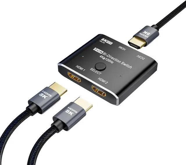 Bi-Direction HDMI 2.1 8K Switch/Splitter:The HDMI switcher allow you to connect two HDMI sources to one HDMI display(Switcher) or connect one HDMI source to toggle between two HDMI displays(Splitter).The length of the HDMI cables connected to both ends of the switch should not exceed 3 meters respectively.A HDMI 8K Cable provided.In case insufficient power Supply,please connect usb cable for Power Supply.This switch with a size of 6.5*5.5*1.5cm.