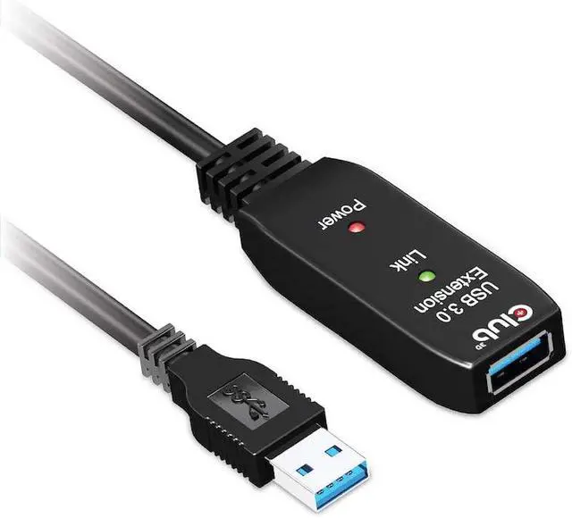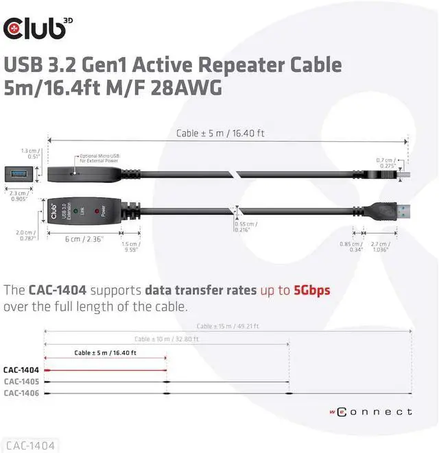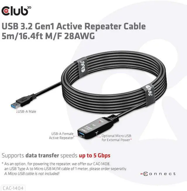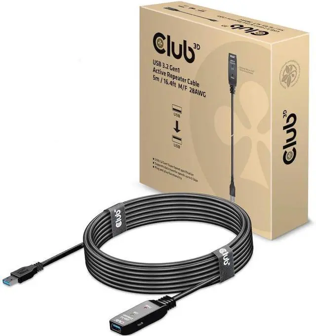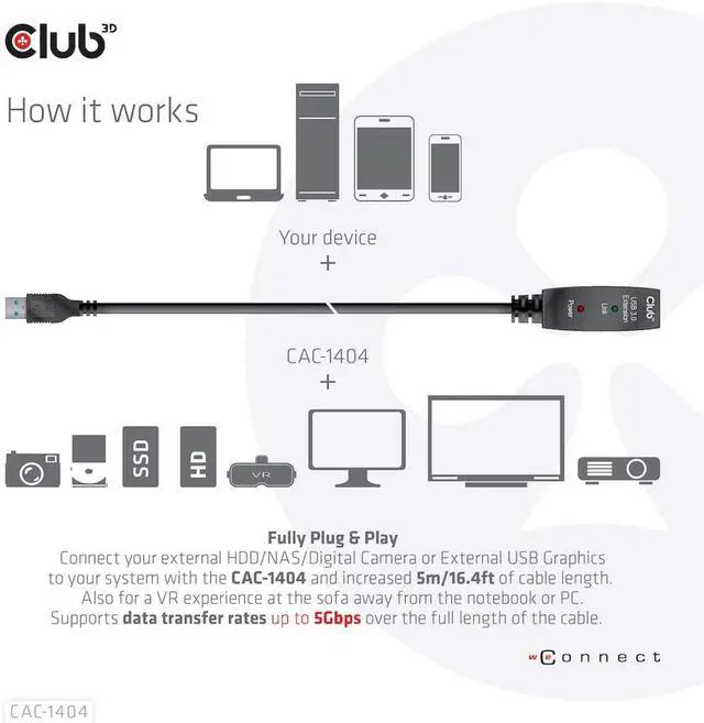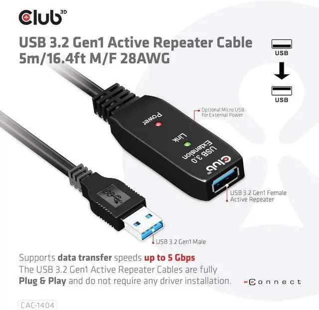 With this Club3D USB 3.2 Gen1 active extension cable CAC-1404, you can go significantly further than the standard USB cable length limit of 3 meters without losing speed during data transfer. The active USB 3.2 Gen1 extension cables are fully plug external USB product, such as external HDD/NAS/digital camera or external USB graphics with your system via the CAC-1404 and benefit from the flexibility of an additional 5 metres. Also for use with VR glasses on the sofa, so at a distance from the notebook or PC, this cable allows you significantly more freedom of movement.