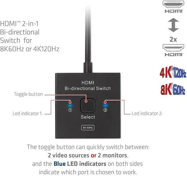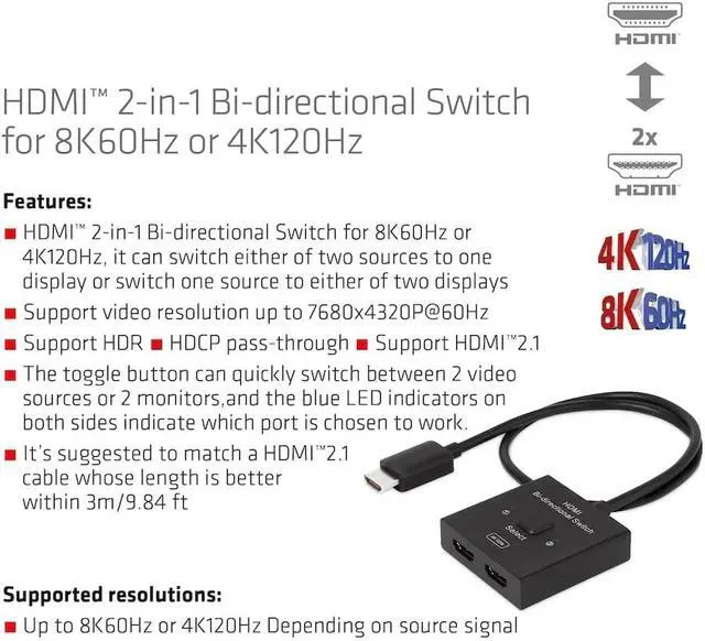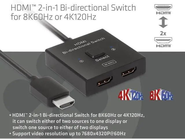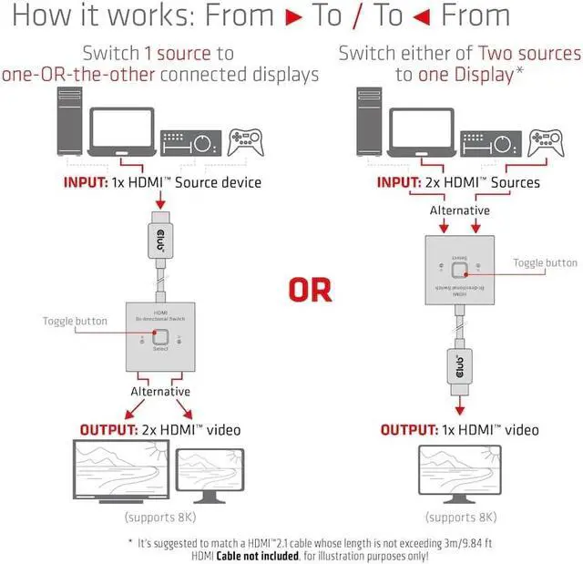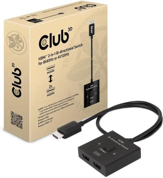 The Club 3D CSV-1384 is an HDMI 2-in-1 bi-directional switch for 8K60Hz or 4K120Hz. It can switch one of two sources to a display or switch one source to one of two displays. Press the Shift button to select Channel 1 or Channel 2. With the 50cm flexible HDMI cable (Pigtail), this switch not only reduces costs, but also saves time for the customer. This type of HDMI switch routes high-resolution video (in multiple resolutions and up to 8K60Hz) and digital audio from the sources to the display devices.
