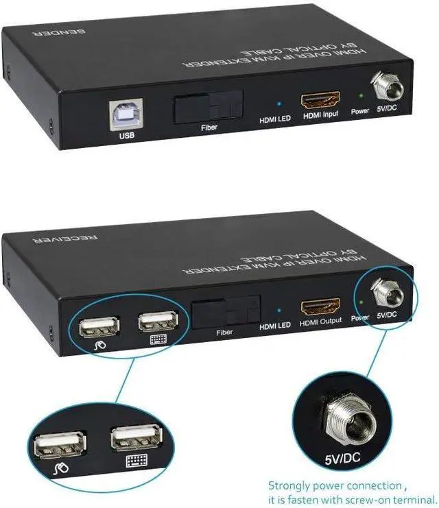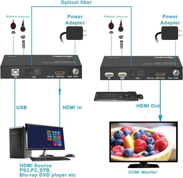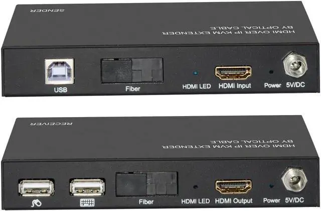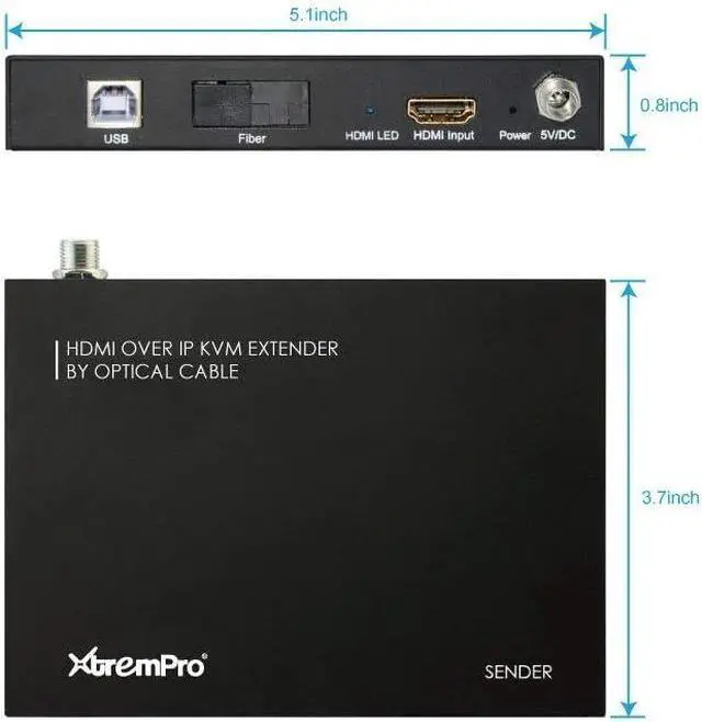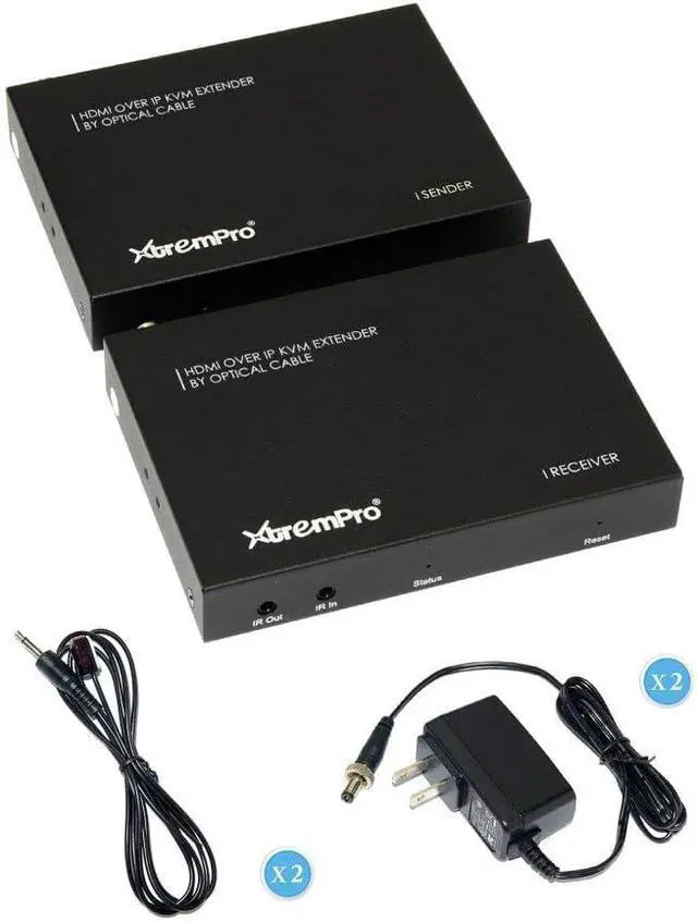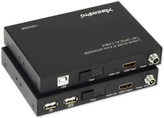 XtremPro HDMI ExtenderKVM Over IP Optical Fiberw/ IR Single w/ Transmitter and Receiver Up to12. 4Miles / 20KM, SupportUSB Keyboard & Mouse Black (61010) This HDMI over IP KVM Extender use the advanced M-JPEG as the compression type, which makes it occupy lower bandwidth and transmit over the fiber more smoothly. The over IP solution is widely used in various locations, like meeting room, classroom, metro, airport, home, mall advertisement. . . etc. Features: Build in EDID Support LPCM Audio format Support USB Keyboard and Mouse Using M-JPEG compression encoding, support resolution up to 1080p@60hz Comply with TCP/IP protocol, Transmit up to 20KM@1080p/60Hz over single optical fiber Bi-direction Wide-band IR passes through to control the source or sink device. (38khz to 56khz) Package Contents: User manual x1 IR-Blaster cable x2 IR-Receiver cable x2 Main unit Receiver x1 Main unit Transmitter x1 5V Power adapter x2 Putin: 100 - 240V 50/60Hz 0. 4A Max Putout: 5. 0V 2000mA