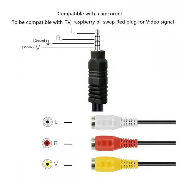 • 3.5mm mini AV to 3 RCA (Phono) cable. Connects a camcorder video and stereo audio output to a TV, monitor or video capture card input.