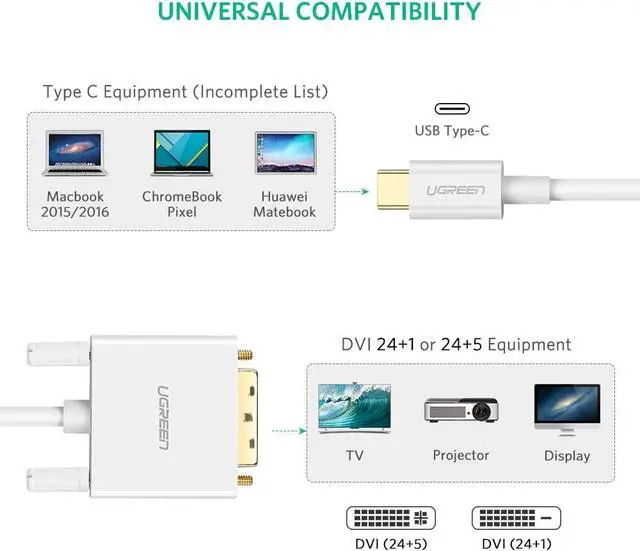 UGREEN USB C DVI Adapter Cable is designed to expand a DVI video output for the latest generation of devices with USB-C ports, including Huawei Mate 10, 2017 MacBook Pro, 2017 iMac, 2016 MacBook Pro, 2015 MacBook, Chromebook Pixel, Dell XPS 15, XPS 13-9350-R1609 13.3",Lenovo Yoga 900(Yoga 4 Pro) , Samsung Galaxy Note 8/ S8/ S8 Plus, Lumia 950/950XL etc.