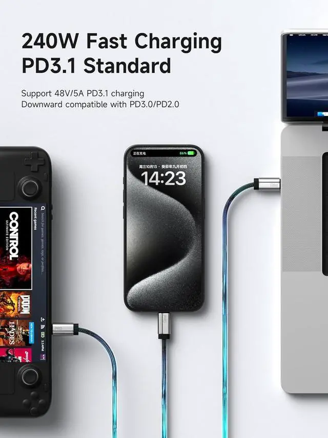 • 240W Fast Charging: Built-in E-marker chip, PD 3.1 standard supports 240W fast charging, while it is backward compatible with PD3.0 and 2.0 protocols,Supports high power output of up to 48V5A. And also compatible with 140/100/60W power devices. Charge USB C devices from phones to laptops