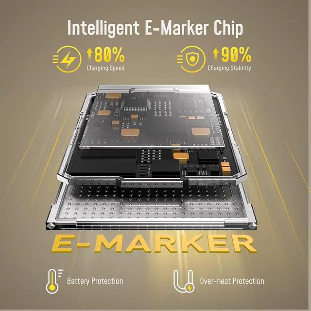 240W Ultra Fast PD 3.1 Charging. Engineered for high-performance power delivery, this cable supports the latest PD 3.1 protocol with up to 240W output. An integrated E-Marker chip intelligently communicates with connected devices to negotiate optimal power levels, ensuring voltage stability, thermal safety, and reduced wear on both cable and device.