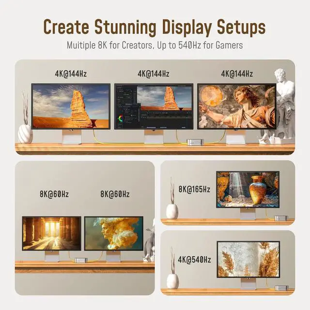 Dual 8K or Triple 4K Display at Distance. Supports a single 8K@165Hz or 4K@540Hz monitor, dual 8K@60Hz, or triple 4K@144Hz displayseven from a distance. Fully compatible with DisplayPort 2.1 and multi-screen daisy-chaining. Build your high-performance workstation without being limited by cable length