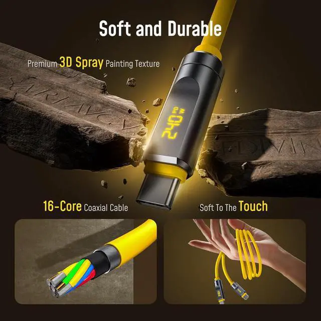 240W Ultra Fast Charging with PD 3.1. Equipped with the latest Power Delivery 3.1 protocol and a smart E-Marker chip, this cable delivers up to 240W (48V/5A) of stable power output. Safely charge your laptops, tablets, smartphones, and docking stations at maximum speed while the built-in smart display shows real-time wattage allowing you to monitor charging power at a glance