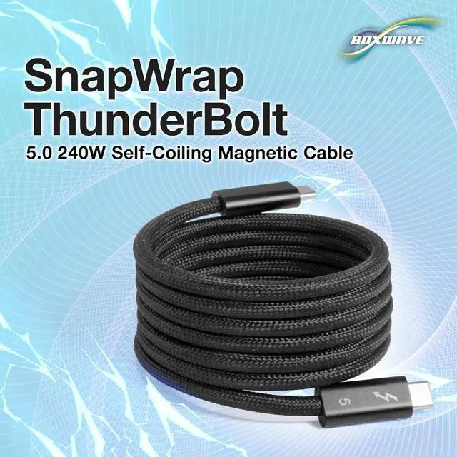 Introducing the BoxWave SnapWrap Thunderbolt 5.0 Cable - a high-speed, high-power cable that delivers up to 80 Gbps data transfer and 240W charging, with a magnetic self-coiling design and rugged 5-foot (150 cm) flexibility for clutter-free performance.