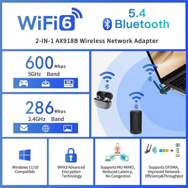 AX918B Adapter Features Wi-Fi 6 Function with High Speed 802.11ax 900Mbps