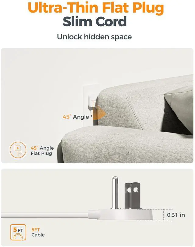 TESSAN right angle flat outlet adapter can easily fit behind any furniture which is close to the wall, it allowes to push your couch right up against the wall and still able to use the outlet behind the couch
