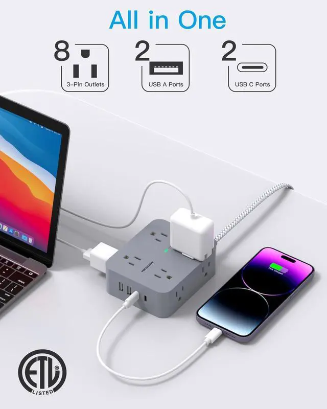 3 Side design 8 widely spaced AC outlets can fit for larger adapters without blocking each other. The compact design saves more space, suitable for the home, office, and college dorm room
