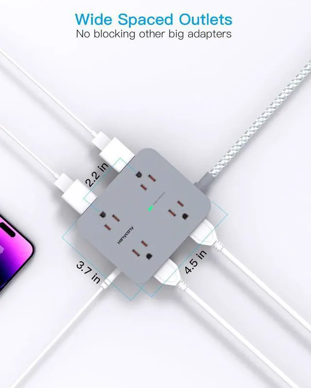 8 WIDE AC outlets with 2.2 inches space in between and 4 USB high-speed charging ports. Charge and power everything from major appliances to your phone.