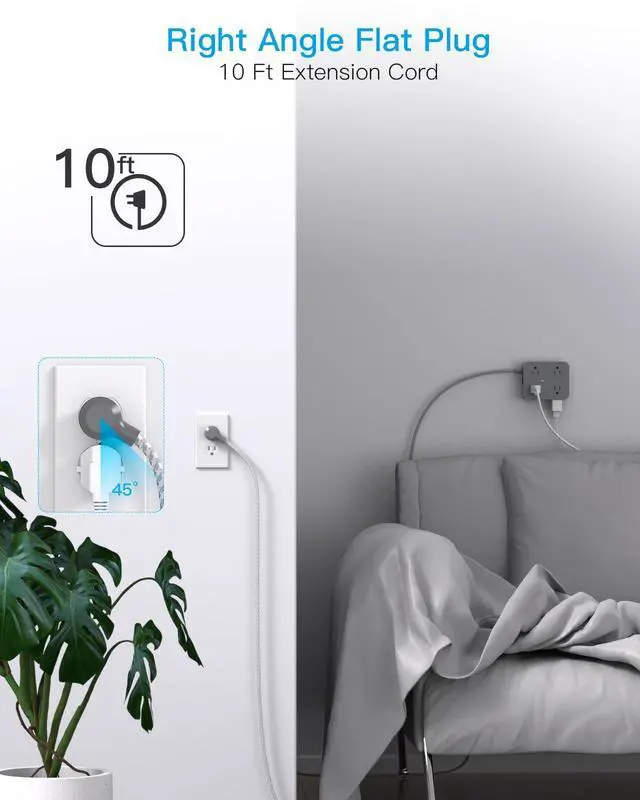 Wall mount design and right angle flat plug with 10ft extension cord can allow you install this power strip on various places, its a great desk or wall usb charging station for phone, tablet, PC, TV and more.