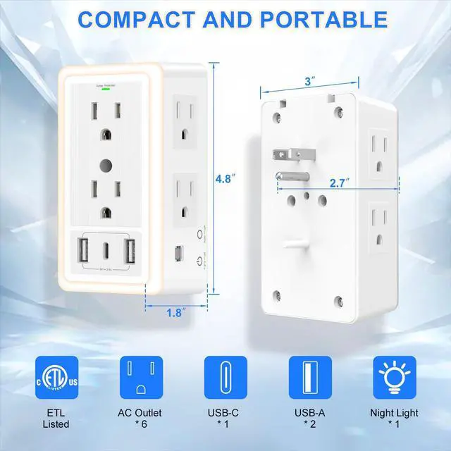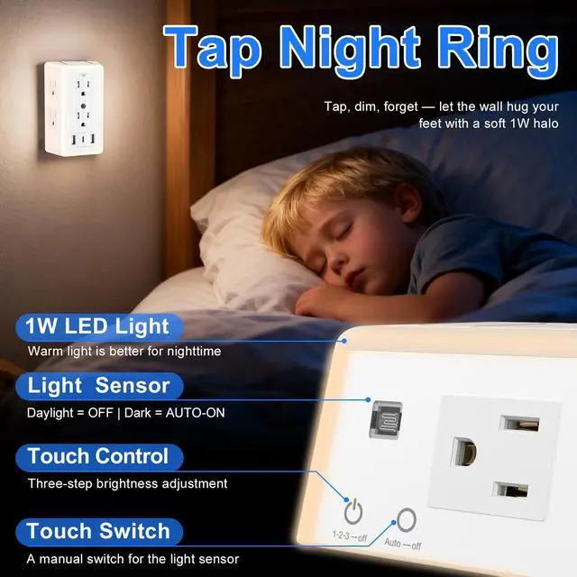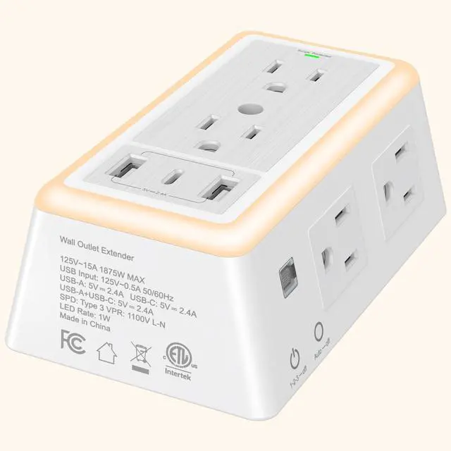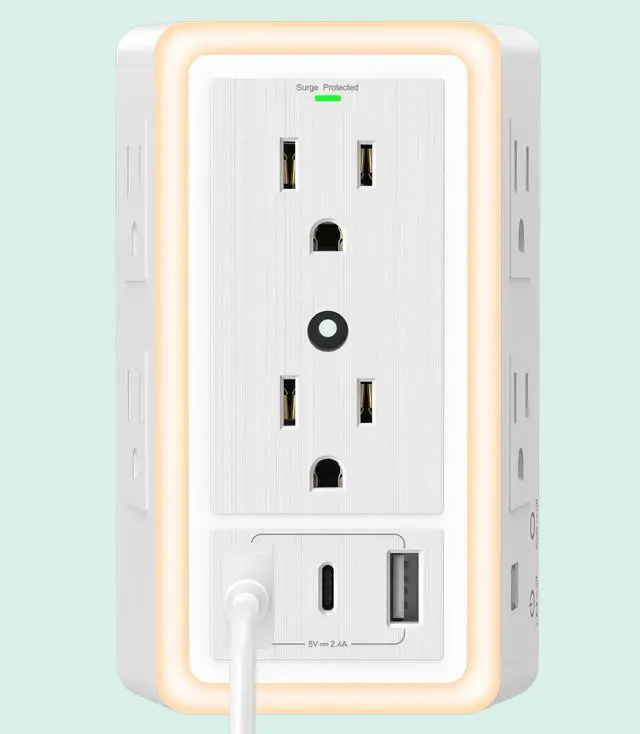 USB Wall Outlet Extender Multiple AC Outlets Power Hub 9 in 1 Splitter Conversion With USB Charging Ports Surge Protection Night Light Dusk to Dawn Sensor Switch ETL Listed
