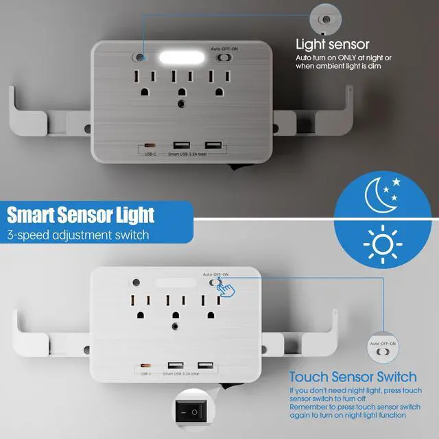 Smart Night Light,automatically turns on when ambient lighting becomes insufficient and off at daytime. Provide emitting gentle light that is easy to your eyes. Creating a nice and clean charging station.