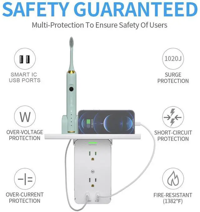 Wall outlets with shelf has USB parts at the same time there are with 1020J surge protection, in the process of using the surge indicator will light up, effectively protect the life of the inserted equipment, to avoid fire, lightning disaster and other accidents!