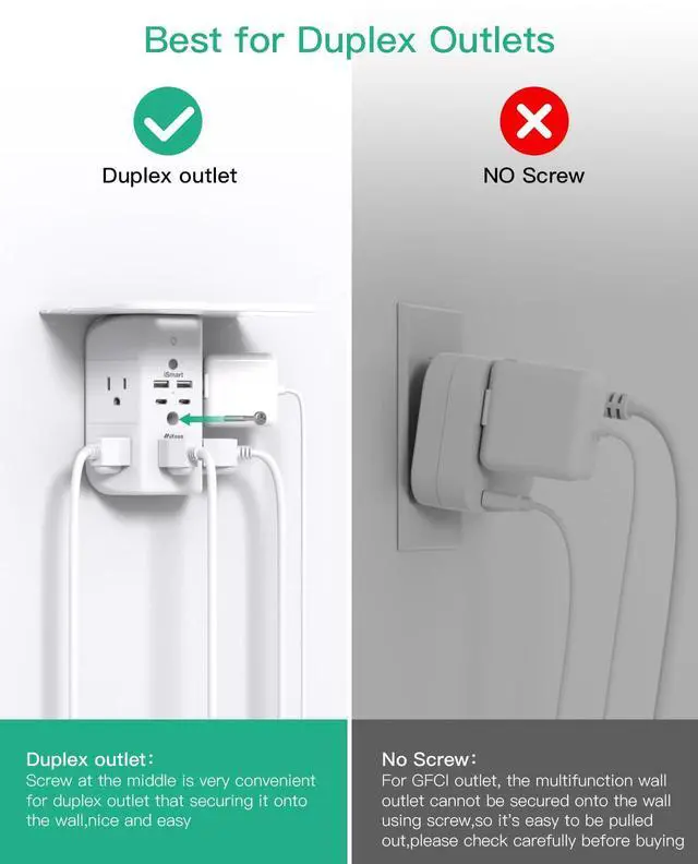 Just plug into a power outlet, this USB outlet can expands 1 outlet to 5 AC outlets & 4 smart USB charging ports which allow you to power up to 9 devices simultaneously.