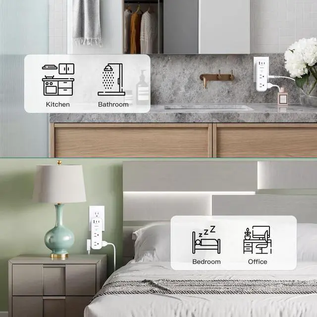 6 AC outlets with 3 sides, built-in 1800 Joules surge protector with long space in between, larger than standard socket. Larger spacing makes it easier to use for all kinds of equipment.