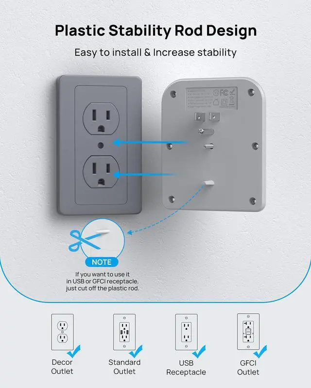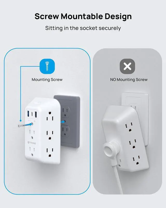 11-IN-1 Multi Outlet Wall Plug: This power outlet extender has 8 AC outlets, 2 USB A ports, and 1 USB C port, which allows you to power up to 11 devices simultaneously. great for charging laptops, lamps, phones, and other devices. Perfect choice for bedroom, kitchen, living room or office. Multi Plug Outlet with USB Ports: The wall plug extender features 2 USB-A ports and 1 USB-C port. Each USB A port features 5V/2.4A Max output, and the USB C charging port features 5V/3A MAX. Total 5V/3.4A output. Compatible with most USB devices, great for charging phones, watches, earphones, etc. 3-Sided Wide Space Design: The AC outlets of this electric plug multiplier are spaced well apart, cleverly arranged on 3 sides, with 0.98in space in between, facing outwards, which allows more flexibility when plugging multiple bulky plugs in without blocking each other. Wall Mount plug splitter: Comes with the installation screw, this outlet splitter 3 prong is perfect for the duplex standard outlet. Just plug in and secure the screw, the plug expander will stay put when plugging or unplugging adapters. Note: Screw installation only works on standard outlet. For USB or GFCI outlet, the white plastic prong needs to be cut off before use. 1440J Power Surge Protector: With 1440 joules surge protection, this multi plug adapter could safeguard your appliances from power surges, creating peace of mind. The 3 way plug adapter is made of top-grade UL 94 V-0 Flame-Retardant PC+ABS, which improves its safety and reliability.Multiple plug outlet with ON/OFF: The ON/OFF switch with circuit breaker is a big convenience in that you can leave things plugged into this wall adapter with usb ports but still save power, which also can protect your devices when overloading.
