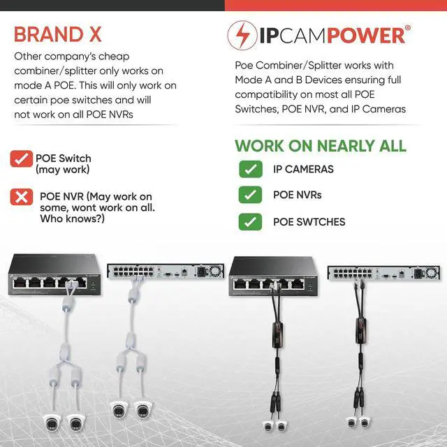 Using IPCamPower's POE Combiners and Splitters, you significantly reduce cable and labor costs by just running one long cable to the areas in which you have 2 cameras side by side.