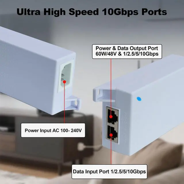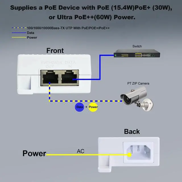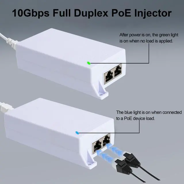 ThePoEstore 10G PoE++ Injector: The 10G PoE++ injector supplies a PoE device with PoE (15.4W)802.3af, PoE+ (30W) 802.3at, or PoE++ (60W)802.3bt power.