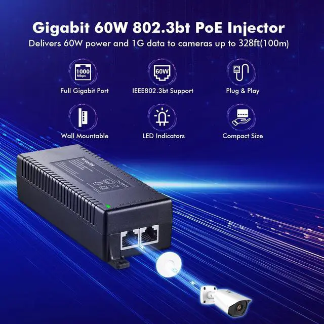 The INJ60W is a Gigabit 60W PoE++ Injector that compliant with IEEE 802.3bt/at/af (PoE++) , It is designed to supply data and up to 60 watts of power to PoE-enabled devices such as network cameras and wireless access points. You can mount it anywhere without a nearby power outlet.